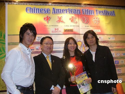 为期9天、在洛杉矶、旧金山两地热闹登场的“中美电影节”接近尾声。11月7日,中美电影节组委会主席苏彦韬把“金天使”奖杯颁给获得十佳电影:《喜马拉雅王子》(Prince of Himalayas)导演胡雪桦、制片人胡雪莲、男主角蒲巴甲,并共同见证洛杉矶、旧金山两地邮政管理局所发行的中美电影节开幕式纪念首日封。 中新社发 卢威 摄