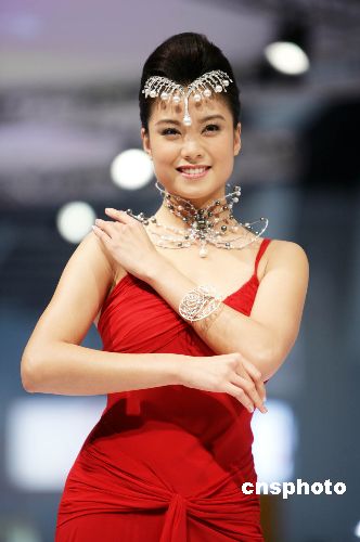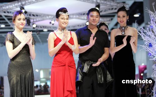 12月7日,明星廖碧儿在香港会展中心举行的“香港国际珠宝展”上,穿着形象顾问邓达智设计的服饰,演绎最受买家欢迎的首饰设计比赛得奖作品。中新社发 洪少葵 摄