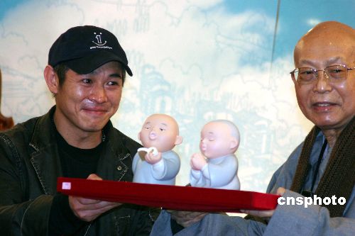 十二月十六日,为宣传新片《投名状》先期抵台的武打巨星李连杰,在台北拜会法鼓山创办人圣严法师,并赠送二百张电影票,支持兴建法鼓大学。图为李连杰(左)接受圣严法师回赠的两只“慈悲小沙弥”。中新社发 董会峰 摄