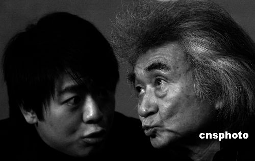 12月29日,日本指挥家小泽征尔与中国钢琴家郎朗在北京新年音乐会的发布会上私语。31日,小泽征尔将携手郎朗献艺在国家大剧院举行的北京新年音乐会。同台演出的还有女高音歌唱家凯瑟琳·巴特尔。中新社发 廖攀 摄