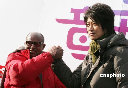 2008年1月2日下午,在北京林业大学体育场里,台湾歌手游鸿明同坦桑尼亚奥运英雄阿赫瓦里共同完成奥运歌曲音乐电视《英雄》的场景拍摄。 中新社发 博芽影像 摄