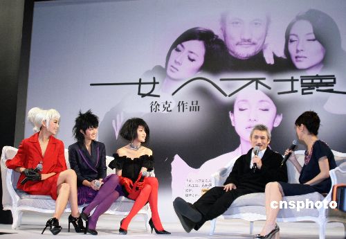 1月8日下午,由徐克指导的最新影片《女人不坏》在北京召开记者会,徐导率三位女主角周迅、桂纶镁、张雨琦一同出席。三位女主角分别以极为“出位”的造型亮相,徐克称不仅是从外形上对她们进行“改造”,还要让这三位从没演过喜剧角色的演员出演喜剧,挖掘出她们不为人知的一面。据悉,周迅在戏中要演包括孕妇、医生、病人、记者、农妇等十二个角色,桂纶镁是一个相当野蛮但是介乎于真实和虚幻里的人物,张雨琦则是绰号“无敌”的以智慧挂帅的女性。中新社发 一可 摄