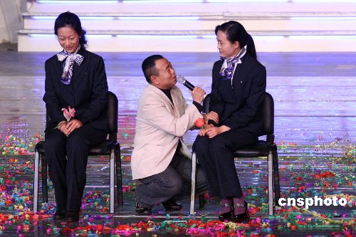 1月9日,2008年新春文艺晚会在河南艺术中心大剧院举行,潘长江和在晚会现场找来的比自己小24岁的年轻妈妈以及一名20多岁的年轻媳妇作为搭档共同表演小品《两个对我恩重如山的女人》。中新社发 陈代述 摄