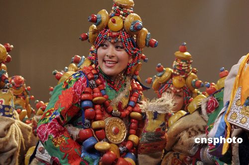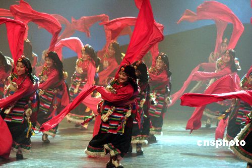 2008年1月21日,著名舞蹈家杨丽萍携《藏谜》在海口人民大会堂上演。《藏谜》以藏族老阿妈虔诚的朝拜路途中所见为主线,表现了藏区牧民生活、民间习俗、宗教仪式场景。主创人员用了1年多的时间,行走在藏、青、川、云等各省区的20多个藏区,大量收集了音乐、舞蹈、器乐、服装等作为原始创作素材。剧中8成以上的演员都是藏区的牧民,完全是原生态的演出。中新社发 尹恩彪 摄