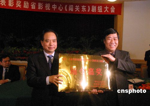 1月31日,山东省委、省政府在济南召开表彰大会,对《闯关东》剧组通令嘉奖,并向山东电影电视剧制作中心颁发奖金200万元。据悉,《闯关东》在央视一套播出后,收视率创央视开年大戏的新高。中新社发 龚辉 摄