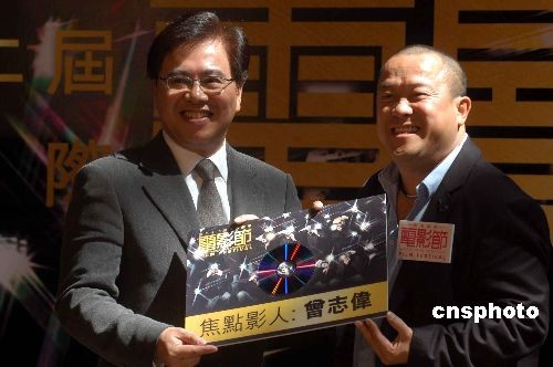 二月二十一日,香港国际电影节协会主席王英伟(左)在记者会上向曾志伟颁奖。由香港国际电影节协会主办的第三十二届香港国际电影节,将于三月十七日至四月六日举行。中新社发 谭达明 摄