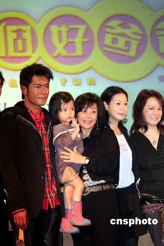香港国际影视展参展影片《一个好爸爸》三月二十日举行新闻发布会,该片由成龙监制,张艾嘉导演(左三)、香港演员古天乐(左一)、台湾演员刘若英(右二)主演。影片将于四月十日全球公映。图为剧中主要演员出席发布会。中新社发 王丽南 摄