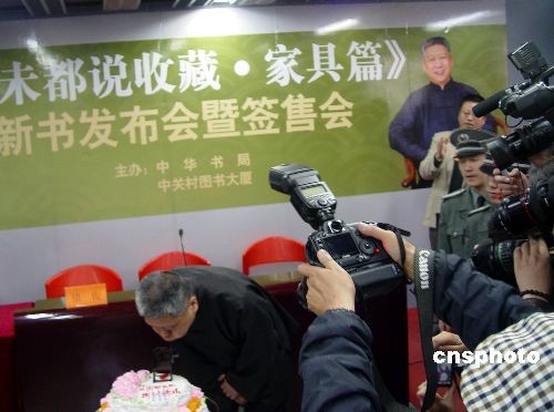 三月二十二日,著名收藏家、鉴定家马未都在北京签售其新书《马未都说收藏·家具篇》。他在中央电视台“百家讲坛”对收藏文化的另类解读,在短时间内积聚了很高的人气,成为继易中天、于丹之后的又一位大众文化偶像。当天是马未都53岁的生日,他在签售现场吹灭生日蛋糕上的蜡烛,有趣的是在蛋糕上伫立着一个巧克力做的古色古香的老式座椅。中新社发 应妮 摄