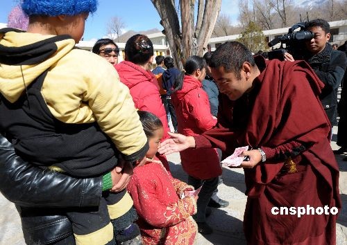 3月22日,拉萨大昭寺的僧人到拉萨救助站慰问打砸抢烧事件中的受害者,并向他们发放了慰问金。中新社发 廖攀 摄