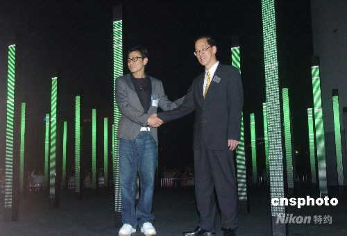 四月十一日晚,由香港艺术发展局主办、Microwave筹办的“灯陆‧亚高高”声光互动媒体艺术展在香港尖沙嘴星光大道开幕,民政事务局局长曾德成与影星刘德华在揭幕后,率先体验由英国著名国际艺术团队United Visual Artists (UVA)创作的“Volume”所带来的视听觉体验。中新社发 邓庆乐 摄