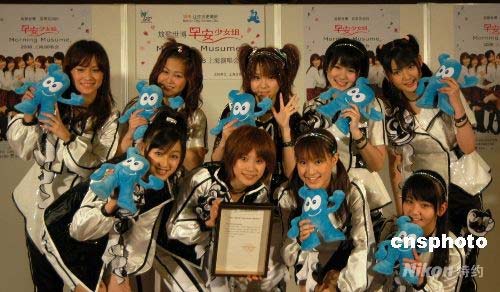 4月29日,上海世博会组委会邀请日本人气组合早安少女参加“放歌世博”上海演唱会的新闻发布会在东京中野Sun Plaza举行。去年首次吸收两位中国籍成员“纯纯”和“琳琳”的早安少女组合,目前致力于亚洲市场,已在日本、韩国以及台湾地区成功举行大型演唱会。2008年6月28日在上海举行的早安少女组合“放歌世博”上海演唱会,将是该组合第一次来到中国大陆地区举办演唱会,她们也是上海世博会“放歌世博”大型演唱活动邀请的第一个日本艺人(组合)。图为早安少女组合开心地与获赠的上海世博会吉祥物“海宝”合影。前排右一、右二分别为中国籍成员李纯、钱琳。中新社发 关妍 摄