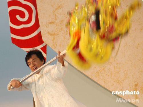 北京奥运会火炬接力三亚传递于五月四日晚六时左右圆满结束,最后一棒火炬手之一的著名影星成龙在当日晚举行的晚会上表演《凤舞天涯》。 中新社发 王辛莉 摄