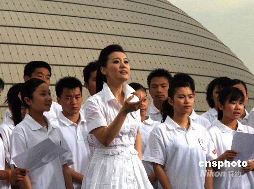 2008年5月8日,北京,国家大剧院前,著名歌手谭晶在为奥运优秀歌曲《天空》拍摄MV。中新社发 张朋 摄