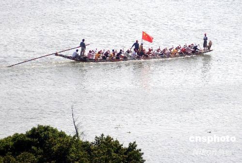 5月11日下午,北京奥运火炬在福州最美的江滨大道上进行传递,福州民众在闽江划龙舟追随火炬传递队伍。 中新社发 王东明 摄