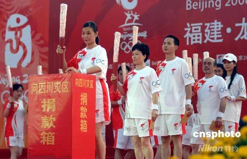 5月13日下午,北京奥运火炬在革命老区龙岩结束“红色之旅”。图为闭幕仪式上,来自福建的火炬手向四川地震灾区人民捐款。 中新社发 王东明 摄