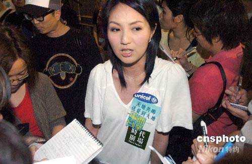 五月十六日晚,香港商业电台在铜锣湾时代广场举办“天地共鸣送爱到大地”筹款活动,呼吁市民踊跃捐款,赈济四川地震灾区。图为香港歌星杨千嬅出席。中新社发 邓庆乐 摄