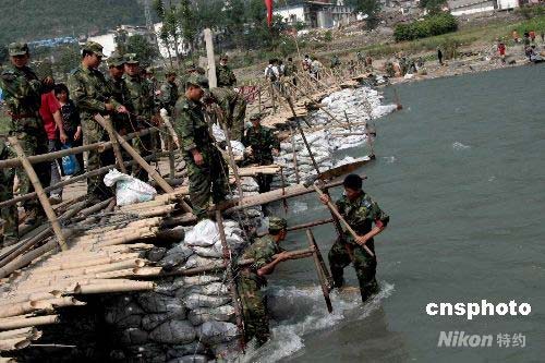 5月26日,中国空降兵某部官兵在水中打桩加固,架设横跨涪江的临时桥梁。汶川地震后,四川平武县南坝镇灾区通向外界的道路桥梁被毁坏,数百名重伤员和2万多名受困群众被困在涪江对岸、受到涪江段堰塞湖溃堤威胁。在此救援的中国空降兵某师决定,在涪江上架设一座低水桥,打开生命通道,确保群众安全转移。经过四昼夜施工,一座长达110多米、横跨涪江的“救命桥”在水流湍急的江面成功合拢。中新社发 谭超 摄