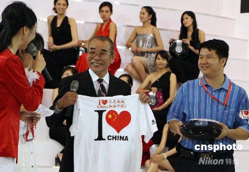 5月30日,在北京举行的第17届中国国际专业音响灯光乐器及技术展览会上,卡拉OK之父井上大佑亮相雷石演出设备盛会现场,图为在活动上井上大佑参加向中国四川地震灾区赈灾拍卖活动。中新社发 钱兴强 摄