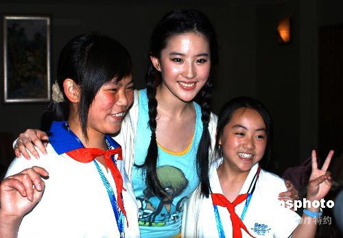 6月2日,89名来自四川北川、彭州、宝兴、崇州等地震灾区失去亲人的儿童,乘坐南方航空海南分公司的爱心专机抵达海南三亚,进行为期半个月的“爱心呵护、阳光行动”心灵呵护之旅。著名影星刘亦菲当日专程赶到孩子们入住的三亚天域度假酒店看望。中新社发 尹海明 摄