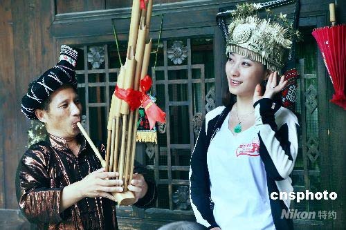 瑶族美女歌手米亮从奥运圣火回到祖国的那一刻起,就一路追随着圣火的脚步,带着未完成的作品《小梦想》,沿着圣火传递的路径收集声音和签名,希望用一首万人合唱的原创歌曲作为奥运献礼。在到达江西老区境内时,正遇四川汶川县发生强烈地震。于是,她毫无犹豫的加入到捐款的队伍,并沿途收集了近千名儿童为灾区小朋友亲手制作的祝福卡,然后又沿途转送给在各地治疗的灾区儿童。被称为圣火传递中救灾捐款的最美女孩。 2008年6月8日,米亮追逐圣火到达南宁,她首先做的一件事,就是到广西区人民医院看望灾区受伤的儿童,并送上祝福卡。美女米亮,为南宁的景色所倾倒,禁不住换上民族服装,在南宁留下美好印记。中新社发 骆文刚 摄