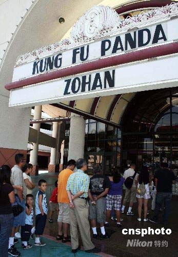 当地时间6月7日,由成龙和刘玉玲等好莱坞著名影星配音的动画片《功夫熊猫》在美国洛杉矶各大影院上映。当地民众排队购票观看新片。刘玉玲希望这部影片能借助2008北京奥运的“中国热”问鼎北美票房。 中新社发 金立冬 摄