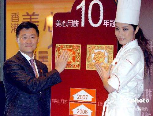 六月二十六日,香港美心饮食集团举行“美心月饼”新闻发布会,集团总经理李文贤(左)与“美心月饼”代言人陈慧琳共同主持本年度新一辑相关食品的电视广告首映礼。中新社发 邓庆乐 摄