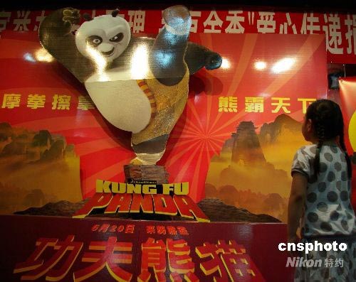 7月3日,北京一家影院《功夫熊猫》的海报吸引儿童。美国动画片《功夫熊猫》在国内上映后,票房势如破竹,一路飘红。截止到上周日,影片全国票房达到9688万元,破亿目标近在咫尺,已成为最赚钱的进口动画片。中新社发 九州 摄