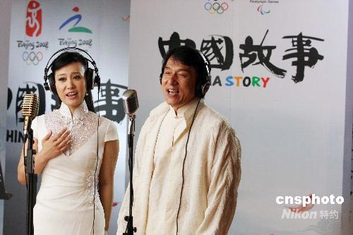 2008年7月8日,北京,2008奥林匹克公园中心区文化展示活动“中国故事”的主题歌《中国看见》正式发布。此歌由国际巨星成龙与著名歌唱家谭晶携手演唱。中新社发 博芽影像 摄