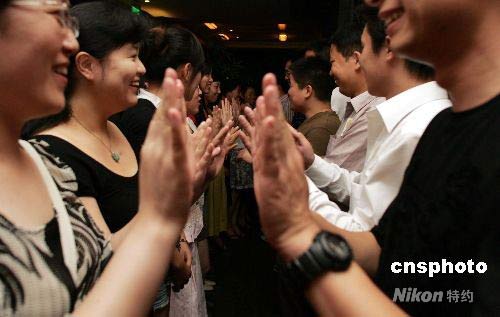 7月19日,众多北京青年在集体相亲会上拍手互动,在活动中寻找自己的爱情。参加此次活动的单身青年大多来自某婚恋网站,很多参加相亲活动的年轻人表示,对于自己理想伴侣的要求更多的是希望相互性格、志向、情趣相投。借助婚恋网站平台线上线下活动去寻找物质生活和精神生活完美统一的伴侣。就像徐志摩的诗,“我将在茫茫人海中寻访我唯一之灵魂伴侣。得之,我幸;不得,我命。”一位参加活动的年轻人笑谈,如果徐志摩生活在当下,一定也会通过婚恋网找到自己“唯一之灵魂伴侣”的。中新社发 杨可佳 摄
