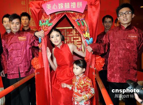 九月三日,某商家特邀即将于十月出嫁的香港歌星陈慧琳穿着裙褂,坐着八人大红花轿出席新闻发布会,为活动宣传造势。中新社发 邓庆乐 摄