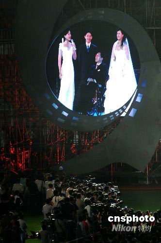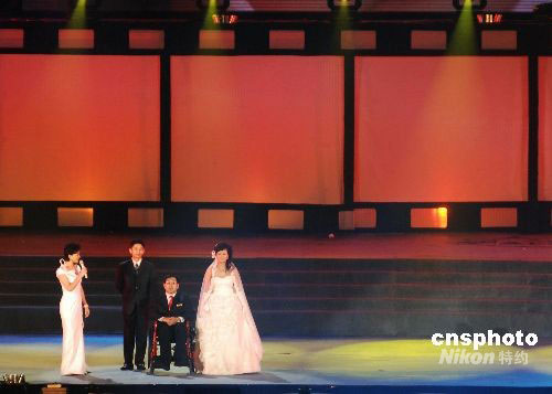 9月10日晚,在辽宁大连市举行的第17届金鸡百花电影节开幕式上,高位截瘫的大连志愿者、2008年残奥会火炬手韩伟与女友陶璐举行现场婚礼,并讲述两人因为电影而结缘的故事。在观众的见证下,两人现场许下爱的誓言,交换婚戒。他们的爱情故事感动了现场的观众。影星邓超为他们送上了自己的祝福。中新社发 刘德斌 摄