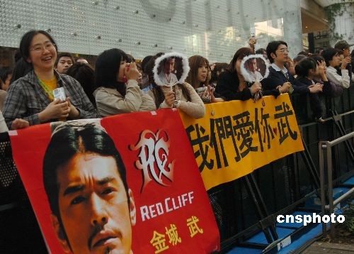 10月18日傍晚,第21届东京国际电影节在东京六本木新城开幕。中国两岸三地影人携手打造的巨片《赤壁》作为揭幕影片,成为开幕式上的最大亮点。图为金城武影迷早早赶到现场,在星光大道两侧等待偶像。中新社发 朱沿华 摄