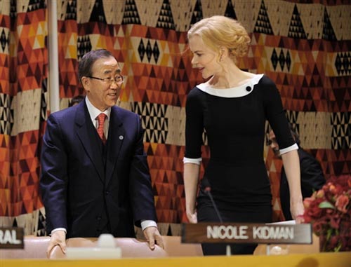 美国当地时间11月25日,身为联合国妇女基金会亲善大使的奥斯卡影后妮可·基德曼来到纽约联合国总部出席一项保护妇女免受暴力的公益活动。联合国秘书长潘基文也出席了当天的活动还为妮可扶座椅显示绅士风度。