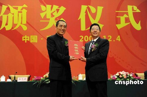 十二月四日,中共广西壮族自治区委员会、广西壮族自治区人民政府授予著名导演张艺谋“广西杰出贡献奖”,奖励一百万元人民币。中新社发 蒋雪林 摄