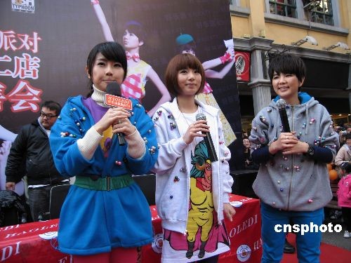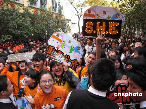 12月20日,台湾人气组合S.H.E在昆明为其新专辑《我的电台FM S.H.E》举行现场签售活动。尽管签售活动定于下午4点半开始,但热情的歌迷中午12点就赶到现场排队等候。S.H.E甫一出场,即引来现场两千多名歌迷的疯狂尖叫。中新社发 刘子倩 摄