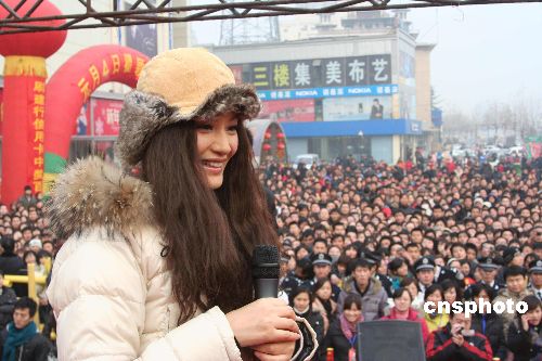 2009年1月4日下午,中国著名模特瞿颖向在邢台上学的四川灾区学生捐赠保暖衣50套,为他们送去冬日里的温暖。中新社发 陈雷 摄