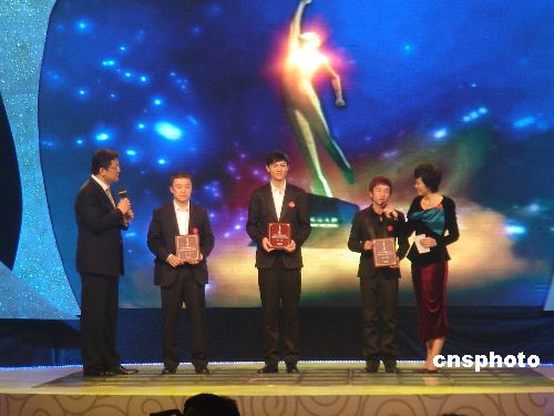 1月17日晚,2008CCTV体坛风云人物提名奖颁奖典礼在成都举行。图为马琳、仲满、邹市明获得最佳男运动员提名奖。中新社发 李乾波 摄