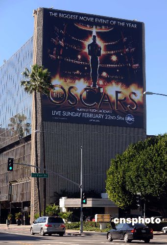 第八十一届奥斯卡电影金像奖官方海报一月二十九日正式公布,一幅巨型官方海报悬挂在位于好莱坞的美国电影艺术与科学学院大楼外。海报以黑色与金色为基调,以奥斯卡颁奖现场“柯达剧院”的舞台作为主要背景,“小金人”的剪影在金色光芒的映衬下显得庄重而大气。中新社发 张炜 摄