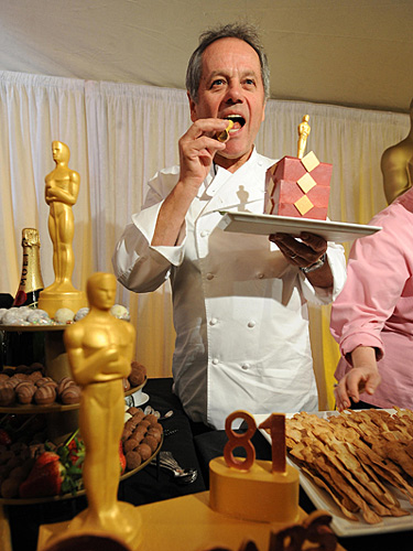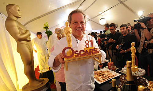 2月19日,负责奥斯卡州长舞会食品供应的主厨沃尔夫冈·普克(Wolfgang Puck)在美国加州好莱坞柯达剧场外的红地毯上,向媒体展示即将于22日晚奥斯卡州长舞会的使用食品与装饰。