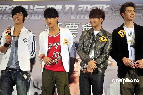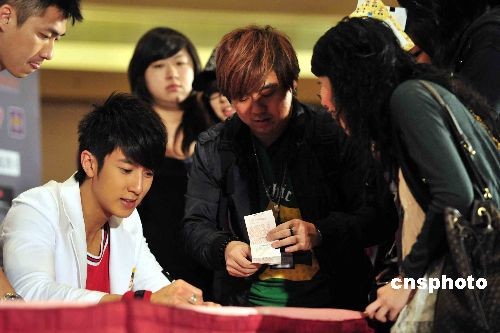 二月二十六日,台湾组合“飞轮海”在香港一商场举行签名活动,为其即将举行的演唱会造势。中新社发 谭达明 摄