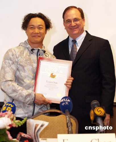 当地时间3月19日,香港歌星陈奕迅飞抵美国洛杉矶参加世界巡回演唱会,受到加州众议员夏乐柏颁奖欢迎。 中新社发 卢威 摄