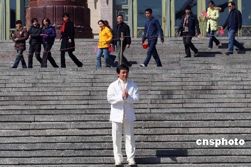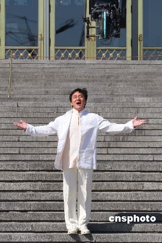4月1日,歌曲《国家》的MV制作进入到了最后几组镜头的拍摄阶段。歌曲主唱成龙在北京人民大会堂台阶上放声歌唱。中新社发 盛佳鹏 摄