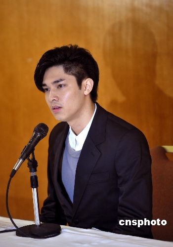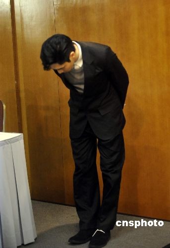 四月二日,在日本被搜出藏有大麻而被拘捕的香港歌星关楚耀,在上周六回港后,首度召开记者会向媒体交待事件。并于媒体面前躬身道歉。中新社发 邓庆乐 摄