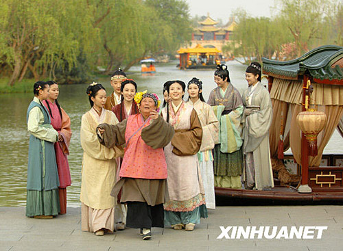 4月8日,在扬州瘦西湖熙春台前,《红楼梦》剧组在拍摄“刘姥姥游大观园”一场戏。近一个月来,新版电视剧《红楼梦》摄制组辗转浙江桐乡乌镇和江苏苏州、扬州等地进行拍摄,并将于近日在扬州瘦西湖完成南方外景地的拍摄任务。赵军 摄