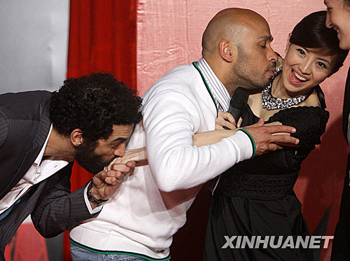 4月9日,法国电影《孤独二兄弟》的导演兼主演、法国家喻户晓的笑星组合朗兹·贝迪亚(左)和埃里克·朱多尔(中)在接受采访时逗乐。当日,由中国国家广播电影电视总局、法国驻华大使馆等单位共同主办的“2009中法文化交流之春暨第六届法国电影展映活动”在北京开幕,该活动将向中国观众展现当代法国艺术舞台的活力和创造力,为中法两国艺术家提供交流的机会。邢广利 摄