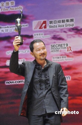 四月十九日晚,“第二十八届香港电影金像奖”颁奖典礼在香港文化中心大剧院隆重举行,香港艺人廖启智凭演出电影《证人》夺得最佳男配角奖项。 中新社发 邓庆乐 摄