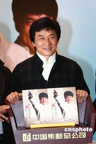 4月29日,成龙现身中国集邮总公司为“成龙个性化邮票”和《成龙纪念邮册》揭幕。图为成龙展示纪念邮票。这套《成龙纪念邮册》中,包含成龙个性化邮票1版(4枚),纪念封1枚、明信片1枚、纪念版张1版和由美国邮政发行的成龙纪念邮票1版。中新社发 李学仕 摄
