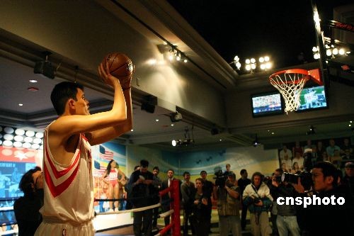 NBA中国球员姚明的蜡像18日首次在纽约杜莎夫人蜡像馆与公众见面,引来众多媒体关注。 中新社发 李静 摄