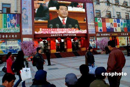 3月3日下午,中国人民政治协商会议第十一届全国委员会第一次会议在北京人民大会堂开幕,举国上下关注“两会”。图为一些农民工在王府井好友世界商场前的大屏幕下观看全国政协开幕会实况直播。中新社发 杨慧峰 摄