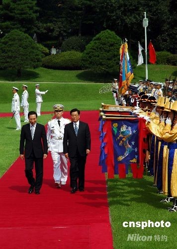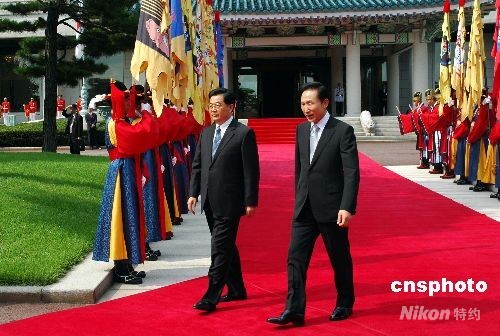 图:李明博举行隆重欢迎仪式欢迎胡锦涛访问韩国